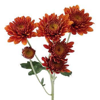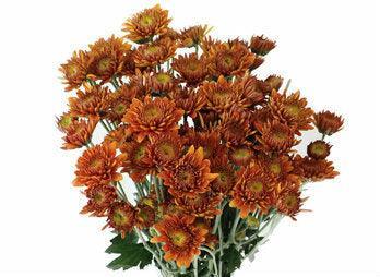 Cushion Mums are a medium sized Mum, with each stem sporting multiple blooms ranging in size from 1 to 3.5 inches in diameter, on average. Cushion Mums have multiple medium length petals surrounding a "pin-cushion like" center. Cushion Mums provide volume as well as a unique textural element that pairs well with just about any type of flower in most floral designs. They pair very well with snapdragons, roses, lilies, stock and gerbera daisies. They are commonly used as a filler flower, but could be used individually in small bud vases for more relaxed farm or wildflower themed events. Our Wholesale Bronze Cushion Mums are only available in the late Summer through Fall and are cut and shipped straight from the farm - and we 100% guarantee their quality and freshness. Once you receive your Bronze Cushion Mums, remove any leafy foliage that will fall below the water line, cut approximately 1/2 - 1 inch off the bottom of the stems and place them in fresh, cool water, preferably with flower food. It is perfectly normal for Mums to look thirsty or "tired" upon arrival. They will perk up once they receive a "fresh cut" to their stems and have time to drink up fresh water. We recommend you receive your Mums 2-3 days before your event.