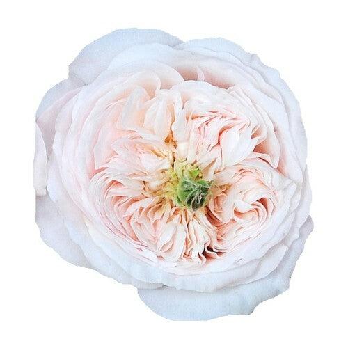 Charity is a David Austin Light peach-pink garden rose - with a lime-green center that creates a dramatic, and attention getting twist. Kiera's soft, swirling, cup-shaped circular petals (a whopping 153 petals per bloom) are highly fragrant with a sophisticated mix of violet, musk, and vanilla scents. Ruffled and romantic, her gorgeous color and bright green eye make her a wonderful choice for today's modern and playful bride. Mix her with textured green flowers and foliages for a gorgeous botanical vibe. Her beauty and fragrance are intense, but lasts only @ 5-7 days, with proper care.