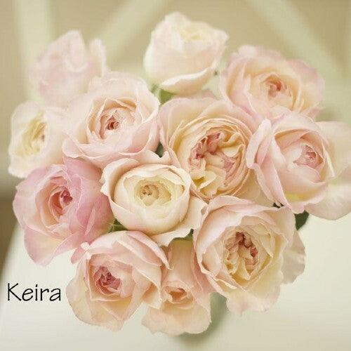 Kiera is a playful blend of the prettiest of pinks.  Kiera's soft, swirling, cup-shaped circular petals (@ 100 petals per bloom) are a mix of creamy and every shade of soft pink, from mid-raspberry pinks to soft blushes - making her a perfect rose to blend with blush/neutral tones as well as mauves, lavenders, and deeper pinks.  As a David Austin rose, she is fragrant with a sophisticated mix of myrrh, almond, marzipan, and vanilla scents.  Ruffled and romantic, each and every bloom is gloriously unpredictable.