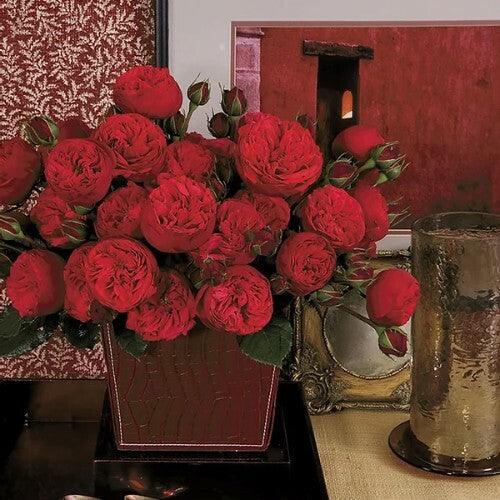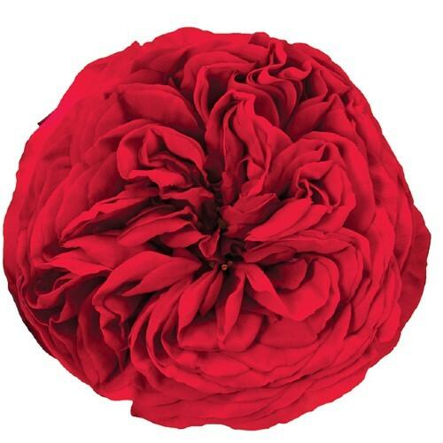 Piano is a classic red garden rose with a perfectly spherical shape - similar to a very large peony bud when fully bloomed out. Red Piano starts out a tight bud of dark red petals on the outside, but as she opens, her deep, globe shaped cup is filled with lighter red petals on the inside. Red Piano's multitudinous petals (@ 120 per bloom) overlap each other tightly, in a swirling pattern, to just reveal a few golden stamens help deep inside her center. Red Piano stems hold both a large primary bloom as well as side stems which contain smaller buds. While these buds will not bloom to the same size as the primary flower, they do a good job of filling spaces between other flowers in a bouquet, creating a true garden effect. Red Piano is not a fragrant rose, but, with proper care, she has a very long vase life of @ 12 days.