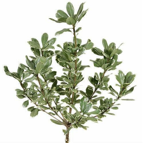 Finish off your bouquets perfectly with our gorgeous variegated Pittosporum. Variegated Pittosporum Greenery features full, grey-green leaves edged in creamy white that provides instant lushness and texture to your floral arrangements. Variegated Pittsoporum's thicker leaf also makes it a wonderful green for lush, thick garlands and table runners. Available year round, Varieagated Pittosporum looks good no matter what season your event takes place in.